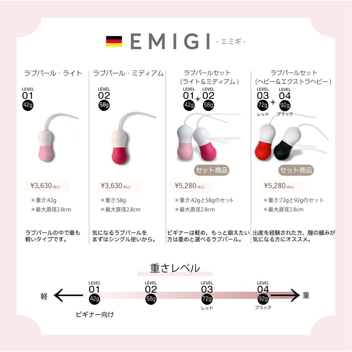 他の画像を見る ドイツ製の膣トレボール EMIGI:エミギ ラブパールセット ヘビー&エクストラヘビー(シンファイブ) 送料無料 NEW 膣トレ 販売価格 ¥ 5,280 税込 詳細を見る お気に入りに登録する