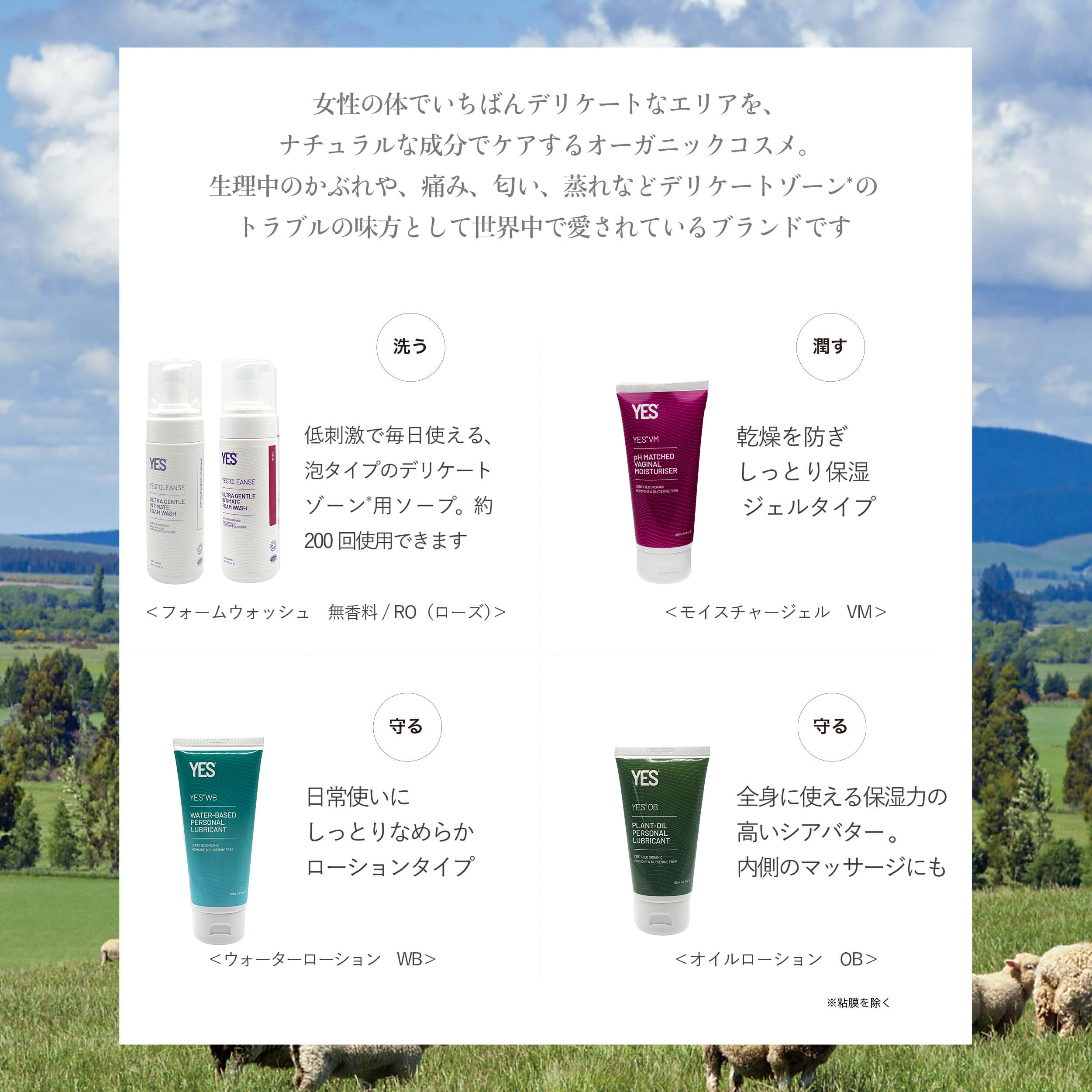 サラサラとした、自然なテクスチャー。デリケートゾーンの肌を整え乾燥から守り、より健やかな環境に導きます。女性の身体を真面目に考えたYES製品で人気No.1のローションです。イギリスの病院や薬局で取り扱われています。