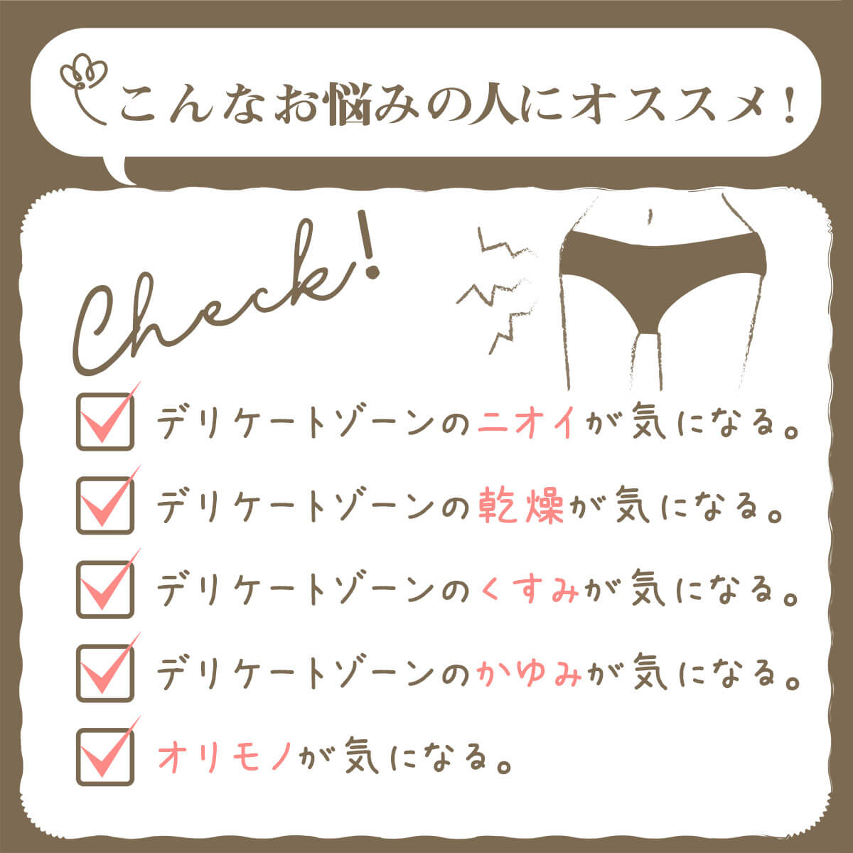 デリケートゾーンは顔と同じくらい繊細。洗った後は乾燥しやすく、保湿をしないとかゆみ・ムレ・ニオイの悪循環につながることもあります。