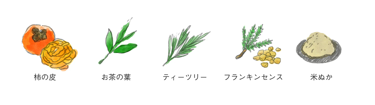 ローズマリー葉水、カキ果皮水、グリセリン、トレハロース、エタノール、チャ乾留液、カキ果皮エキス、カキタンニン、ローズマリー葉エキス、コメヌカエキス、オリーブ葉エキス、グレープフルーツ種子エキス、ベタイン、インドレモングラス油、カミメボウキ油、マヨラナ葉油、ティーツリー葉油、ニュウコウジュ油、リゾレシチン、アルムK、乳酸、乳酸Na、クエン酸