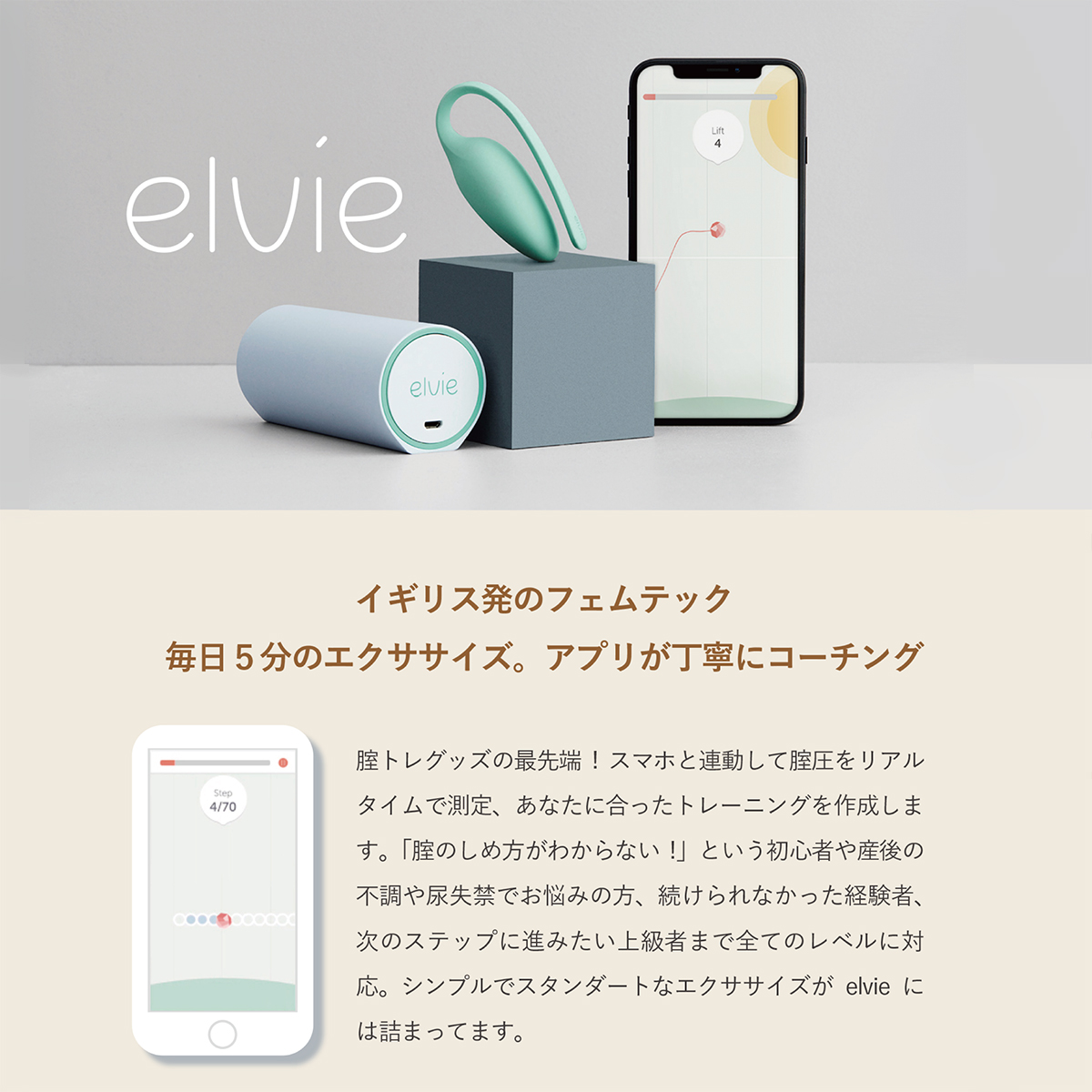 それならelvieが無くても自分で出来るのでは?普通のエクササイズと何が違うの?と思われるかもしれません。が、最もシンプルでスタンダートなエクササイズという骨盤底筋トレーニング方法をアシストするテクノロジーがelvieにはたくさん詰まっているんです。